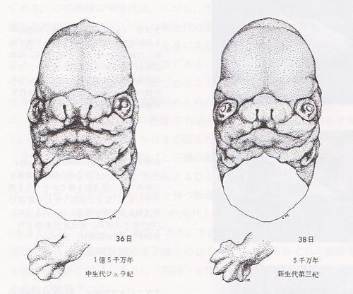 そして、三六日目のそれは、突出した口吻(こうふん)とやや前を見はじめた目、背後の中脳の突出の前方に膨らみつつある大脳は、ニュージーランドの孤島にすむ中生代三畳紀に栄えた原始爬虫類の生き残りであるムカシトカゲの顔を思わせる(半竜半人)。